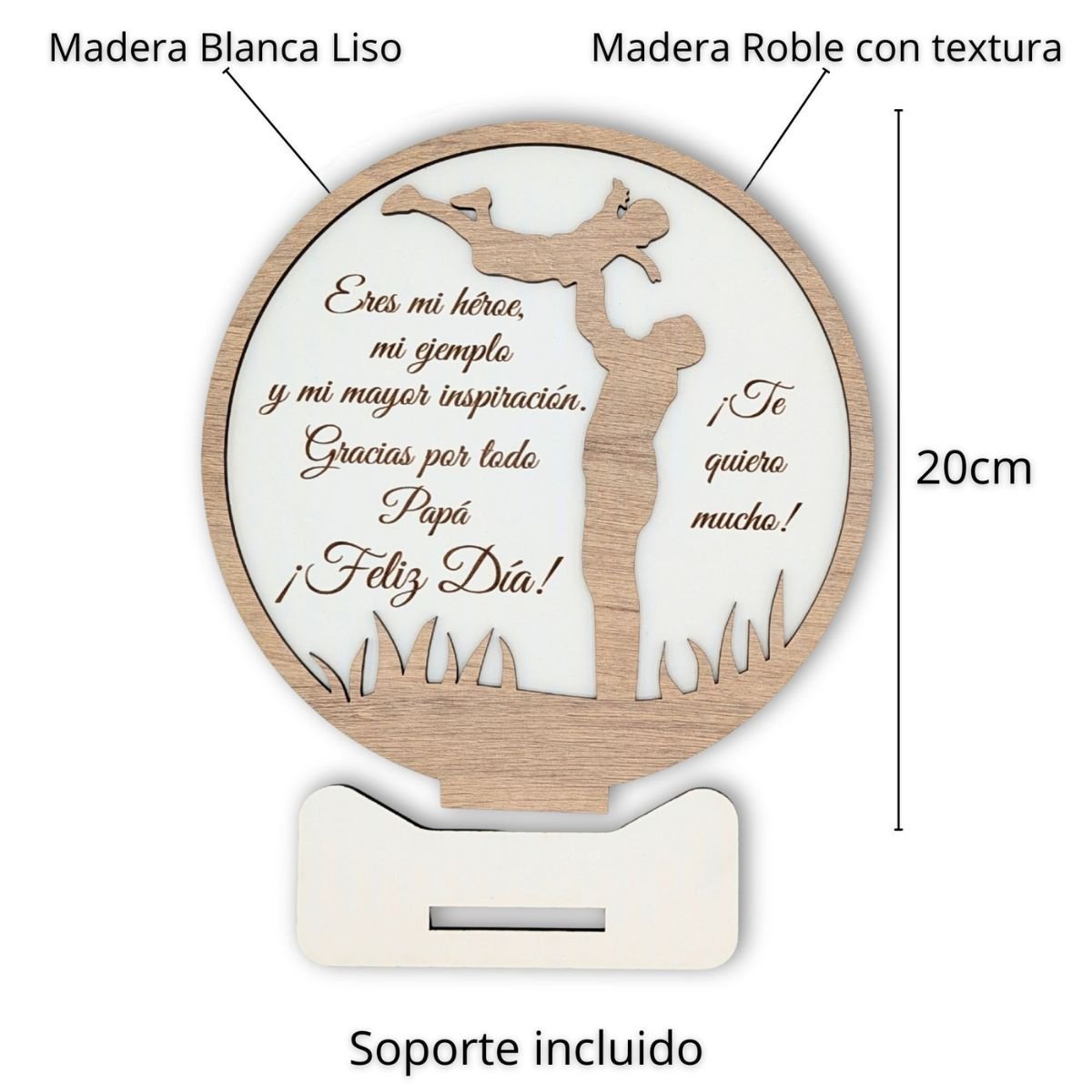 Con un diseño elegante y atemporal, esta pieza de 20 cm de diámetro está fabricada en una combinación de madera en tonos blanco y roble. El producto fusiona la calidez de los materiales naturales con un estilo moderno. Cada elemento de este regalo ha sido pensado para transmitir amor y aprecio, convirtiéndolo en un objeto decorativo lleno de significado que se integrará perfectamente en el hogar de papá. Su contraste de colores y acabados crea un efecto visual armonioso y atractivo que encaja en cualquier espacio, desde su oficina hasta su rincón favorito en casa.